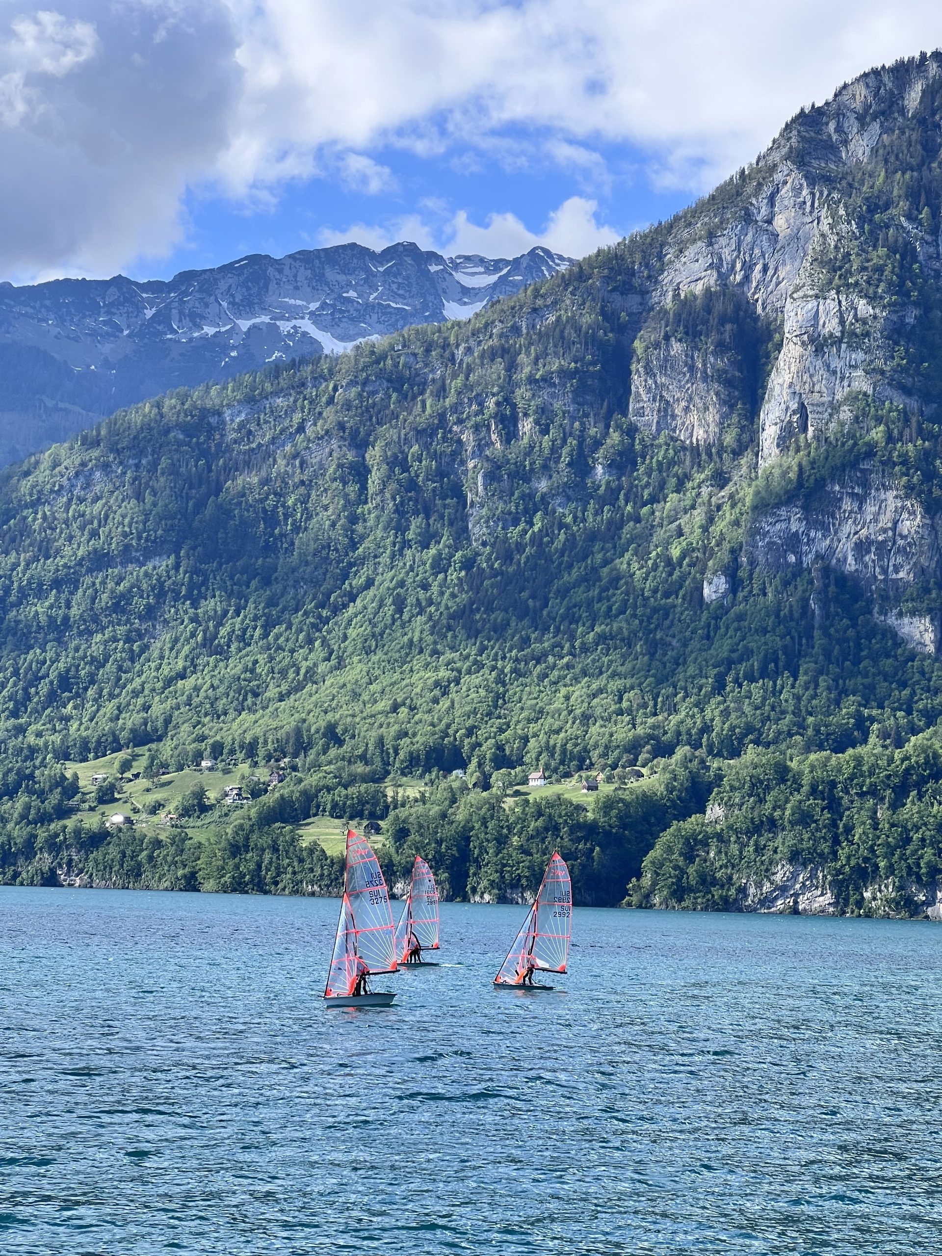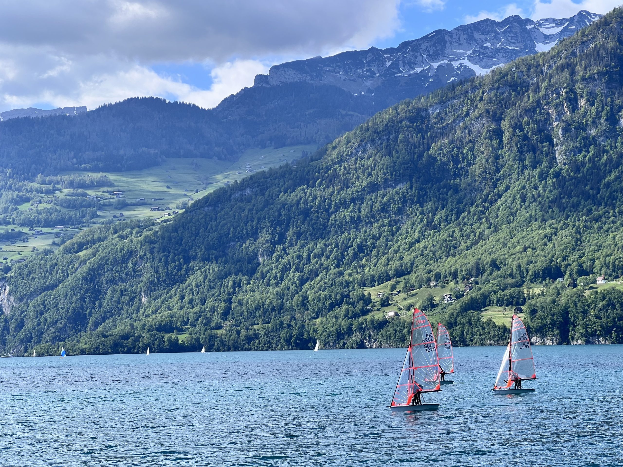 Thierry (ein ehemaliger SYH-Opti-Junior) mit Jacob, Noah (ebenfalls SYH und seit diesem Jahr auf 29er) und Len (dito) waren mit zahlreichen anderen Kids auch in Mühlehorn zur gleichen Zeit in einem Day Camp auf dem 29er. Wir trafen sie immer mal wieder auf dem See und konnten damit einen Blick in die Zukunft erhaschen, wenn man dann den Opti mal im Griff hat und des Alters oder der Grösse wegen eine Bootsklasse weiter gehen will.